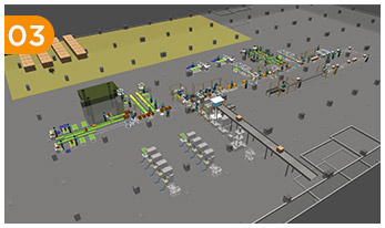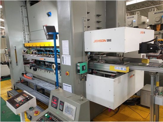 機(jī)器人代替人工搬運(yùn),給沖床上下料,本項目采用7臺捷瞬四軸擺臂沖壓機(jī)器人+1條左右產(chǎn)品碼垛定位輸送機(jī)+1個左右二次定位臺,在原有產(chǎn)線實現(xiàn)無縫對接,滿足節(jié)拍要求,最終達(dá)到每分鐘約12-14次,同時實現(xiàn)固定軌億一沖二整個沖壓工序,同時節(jié)省6-8名人工,整線僅需1人看護(hù)。